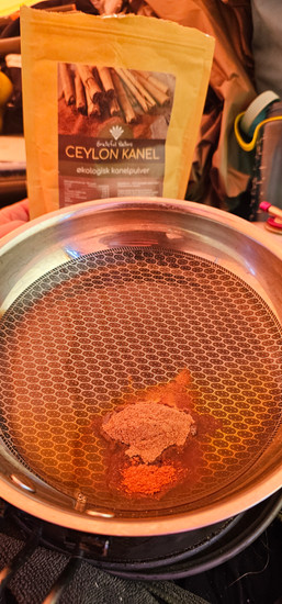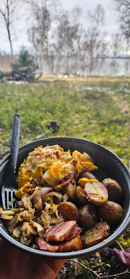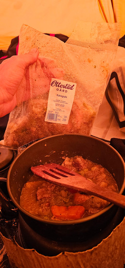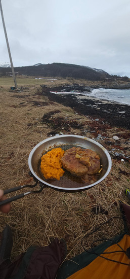 Days 19–20 + 261 turned into more rest days due to rain and wind.I camped near Ottestad farm, one of those rare places where you can buy incredibly local food and taste the difference. I cooked what might be the best burger of the trip so far: a veal burger with bacon, fried in the bacon fat from breakfast. Then I used the same fat in mashed sweet potato with shallots, ginger, chili, turmeric, butter and milk. For dessert, cocoa powder and cocoa butter with chili, local honey and Himalayan salt. Amazing.