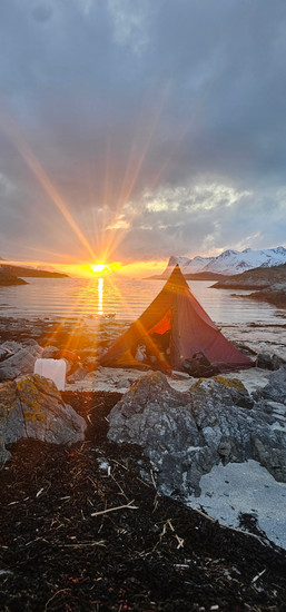 Eventually I reached my goal at Avløysningen on Mågøya, where a small beach was waiting for my Tentipi and the sunset. The weather is beyond my control, so I try to listen to my gut feeling and admire its wild beauty.