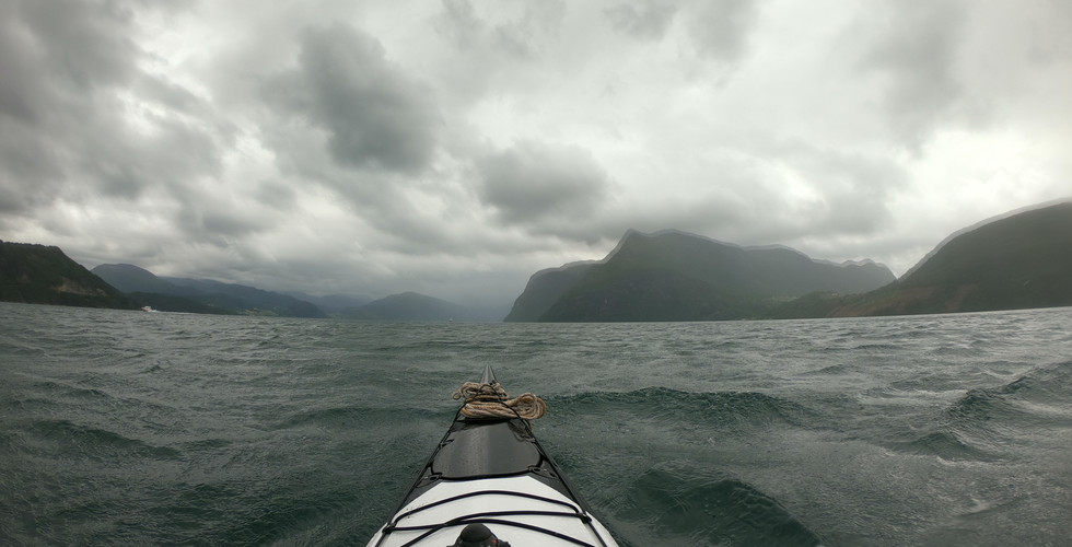 Day45, I wake up early and in the kayak before the tides tunes so i have the tides taking me inn to Storfjorden and after three hours I’m inn where the fjord starts and it’s an amazing sight long tall mountain going straight down to the deep waters. It’s a little windy and rain comes and goes. On my way I witness a rescue chopper saving someone from a hillside. It’s not many places to go inn here so I just keep kayaking until I get to Stranda just as the tides turns at 4pm, the view here has only get better and better for every mile! My plan is to rest for ether six or 18 hours so I get the tide with me, I start out with some food and charging before I kayak my way around the corner where there is a guest port where I place the kayak for the night and set up my camp behind some old boat houses.