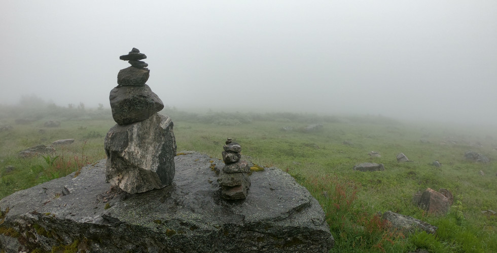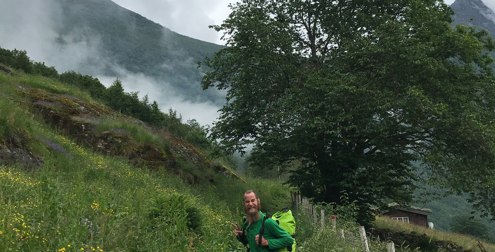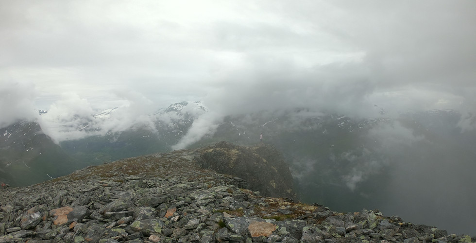 So I go to a warm place in my mind and then I run over the first stretch of snow, let my feet warm up a little and then the next and next….. We can finally see the top and there is no more snow at the last part. Finally we are there and I take a piss of the edge of the cliff and 1500m down I can see where I came in with my kayak a day ago. And after some photos and taking in the view we head back down the mountain again and find out equipment just where we left it and follow the track to Westeraas seter where we set up camp for the night and make a green curry dish before we say good night and go to sleep for the night with a thick fog sounding us in the valley.