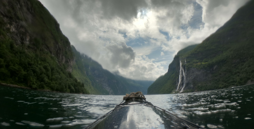 Day46. My body is not ready for kayaking in the night but at 07am I’m awake and full of energy and when I look out at the blue sky and sun shining on the fjords it’s an amazing scenery! I pack down, have my oats and at 8am I’m on my way. I have the tides against me until 10 but I don’t notes that much of a difference. I keep on kayaking trough Storfjorden stopping to record and take photos all the time. So many waterfalls and against all advice I have to kayak under one of them and I do get a little closer than recommended (20m minimum) but I don’t believe the Goods sent me all this way just to see me crushed by a bolder. After four hours of kayaking in Storfjorden I finally reach the last part of the fjord, Geiranger! Geiranger is one of the most visited fjords of Norway. The fjord in 15km long and 258m deep (Storfjorden is almost 700m at the deepest) with high mountain grope surrounding the fjords and at the highest they reach 1700m! No wonder it has made it on the
